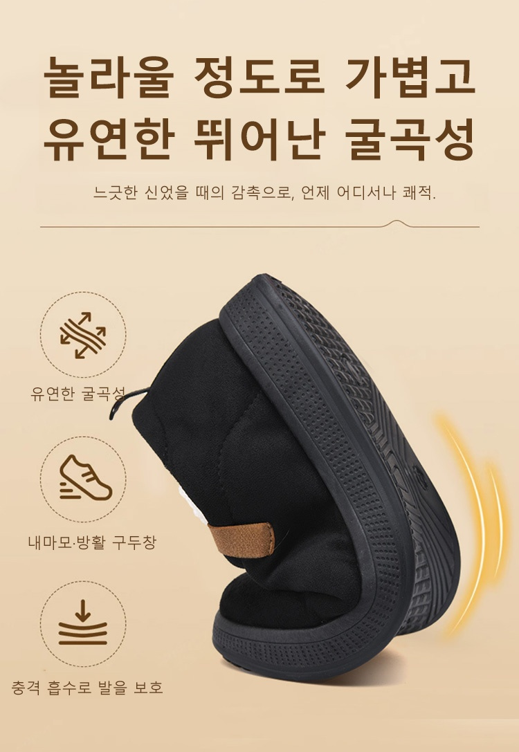 ● 포근한 플리스 안감으로 한겨울에도 따뜻하게 발을 감싸주어 추운 날씨에도 편안한 착용감을 선사합니다. ● 미끄럼 방지 아웃솔로 빗길이나 눈길에서도 안전하게 걸을 수 있어 활동적인 외출에 안성맞춤입니다. ● 슬립온 디자인으로 신고 벗기 간편하며, 코튼 소재가 발을 부드럽게 감싸주어 장시간 착용에도 부담이 없습니다. ● 심플한 디자인과 다양한 컬러로 데일리룩부터 캐주얼룩까지 다양한 스타일링에 손쉽게 매치할 수 있습니다. ● 가벼운 무게와 유연한 밑창으로 장시간 보행에도 피로감 없이 편안한 착화감을 제공합니다.